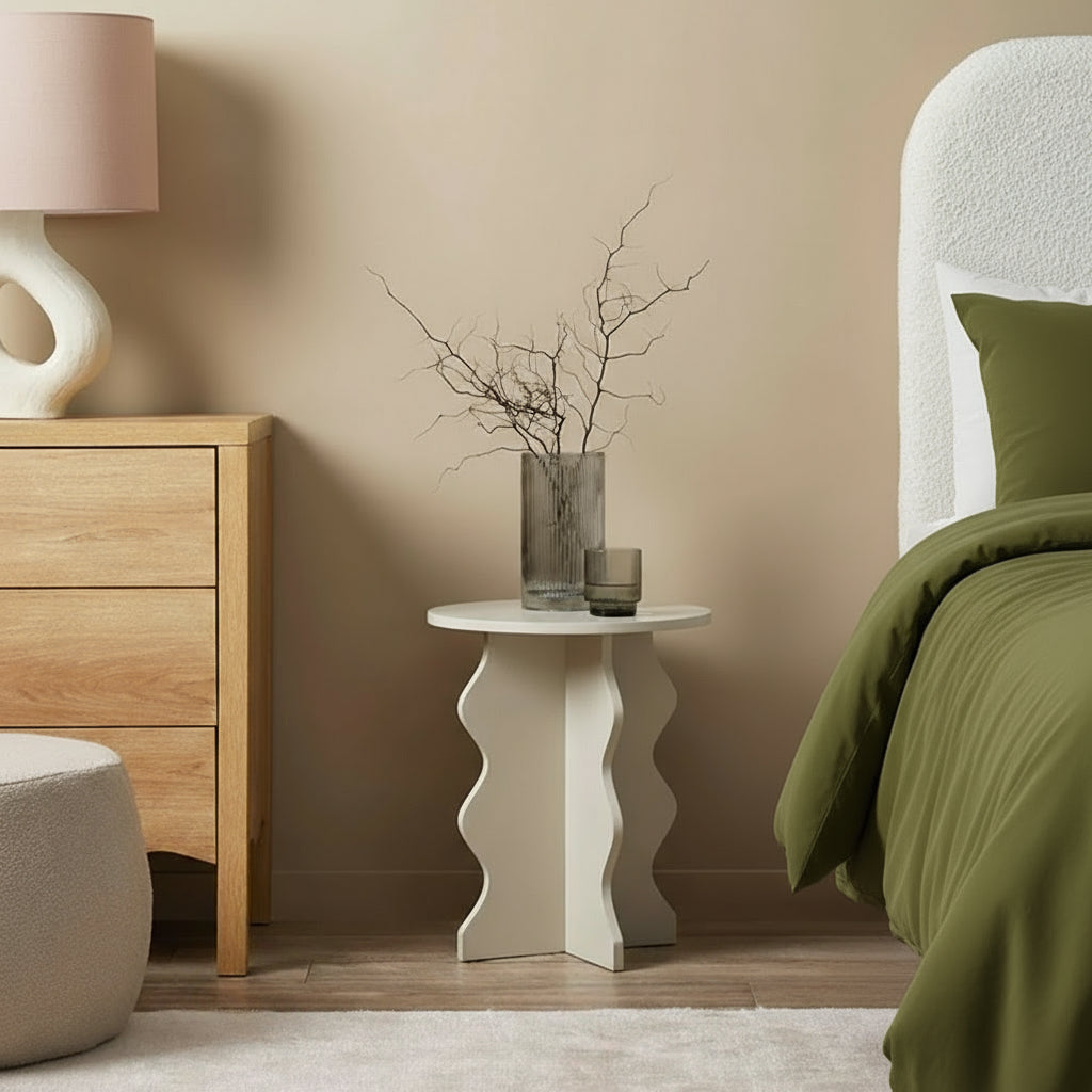The Iris Wavey Side Table brings soft neutrals and modern elegance into your home. With its Japandi-inspired wavy base and minimalist design, it’s a versatile piece that works beautifully in both living rooms and bedrooms.